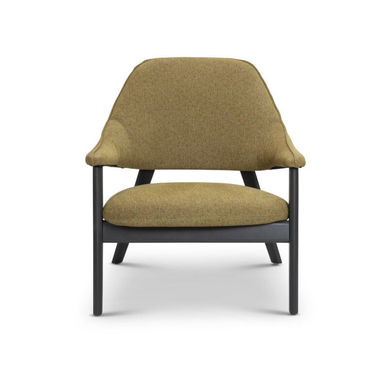 כורסא מעוצבת ואלגנטית. מרופדת בד בגוון חרדלי ורגליים בגוון שחור