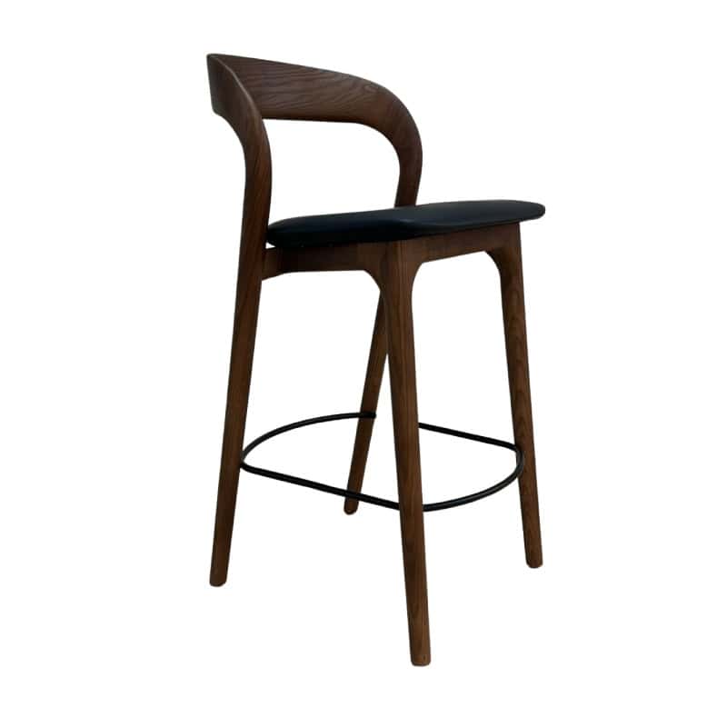כיסא בר אלגנטי, מעוצב, עשוי מעץ בגוון אגוז ומושב מרופד בדמוי עור שחור.