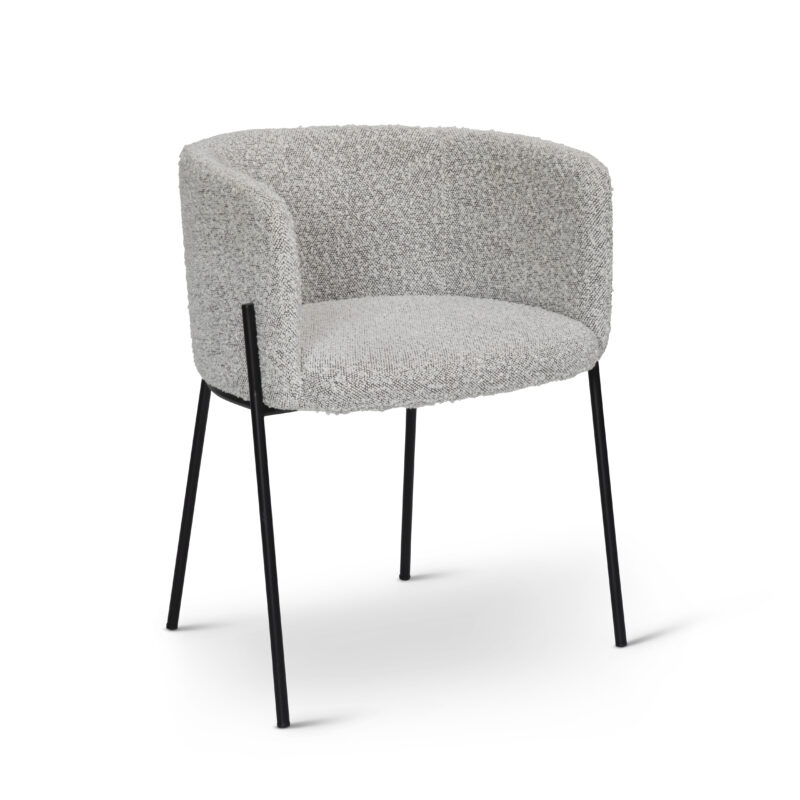 כיסא פינת אוכל מעוצב. מושב מרופד בבד בוקלה בגוון אפור בהיר ורגלי מתכת מושחרת.