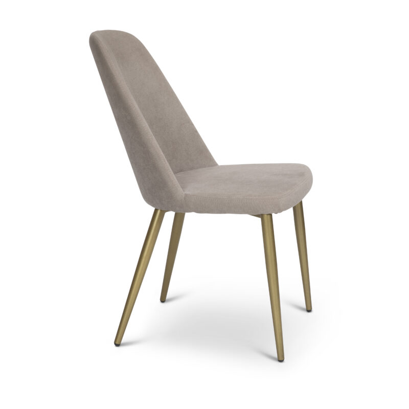 כיסא פינת אוכל איטלקי מעוצב. מושב הכיסא והגב מרופדים בבד רחיץ גוון אפור בהיר ורגליים בגוון פליז.