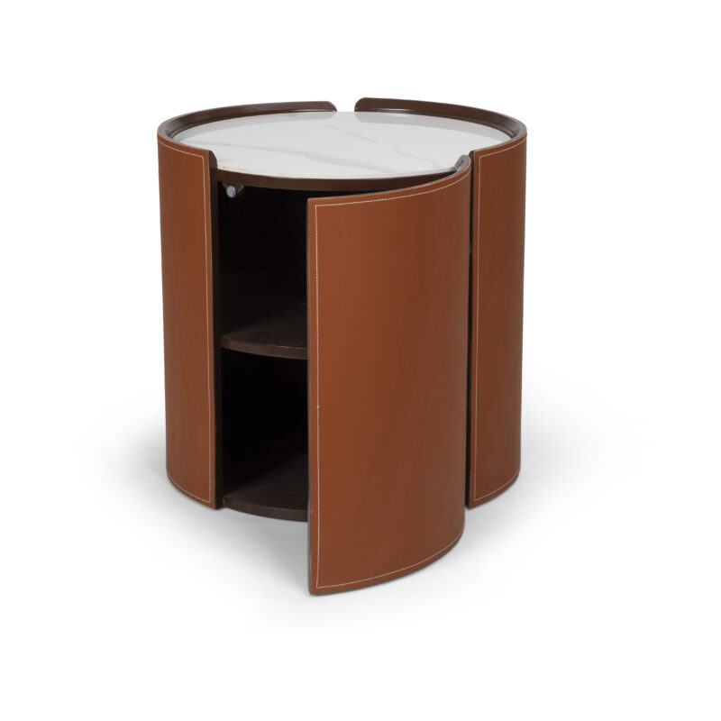 פירוט מוצר – שולחן קפה עגול מעוצב, משולב פלטת פורצלן בגוון לבן וגידים אפורים, בסיס הרגל מעץ מרופד בדמוי עור גוון חמרה. בשילוב שרוכים מעוצבים.