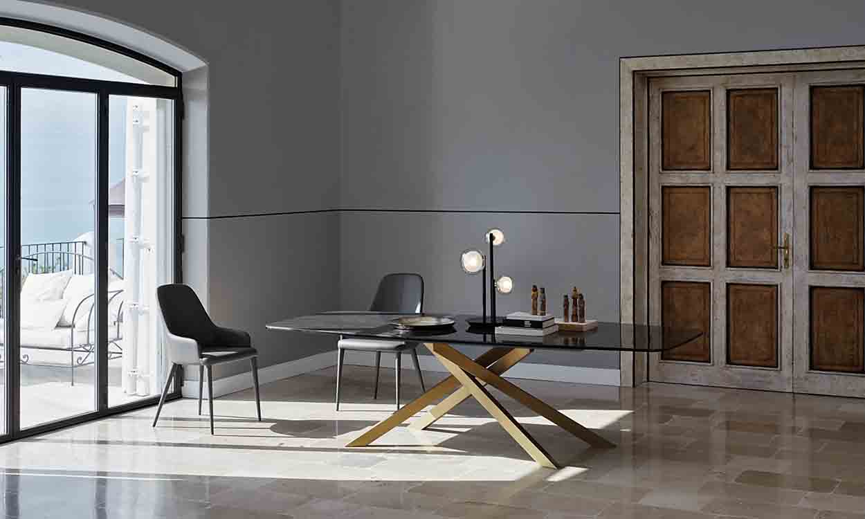 שולחן פינת אוכל מרשים ומזמין , בעל פלטת שיש שחורה ורגלי זהב בהצלבה, עם אפשרות לפתיחה.