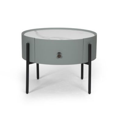 שידה לצד מיטה מעוצבת, בסיס שידה עשוי MDF בגוון אבן, רגליים מצתלבות בגוון פליז מושחר. מגירה אחת, טריקה שקטה.