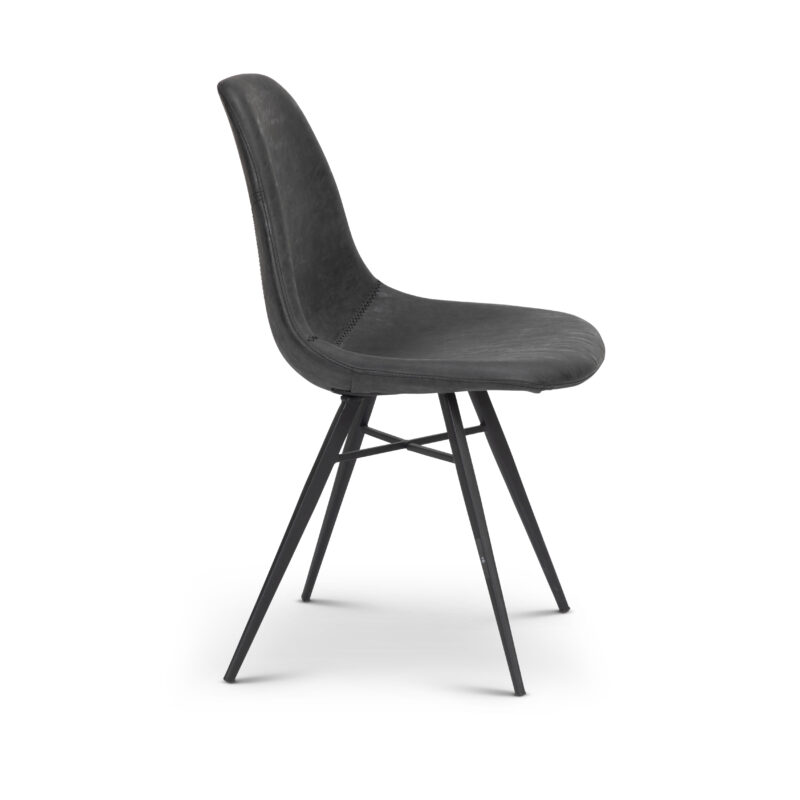 כיסא פינת אוכל מעוצב, מושב מורפד דמוי עור בגוון שחור משופשף. רגלי מתכת מושחרת.