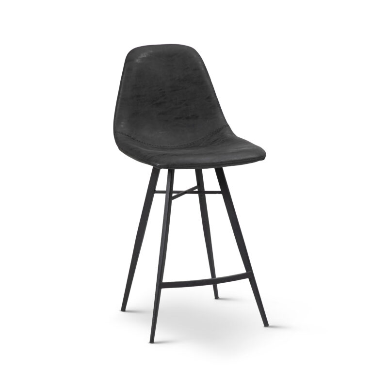 כיסא בר אלגנטי, מעוצב, משולב מושב מרופד סקי בגוון שחור מעושן ורגלי מתכת שחורה.