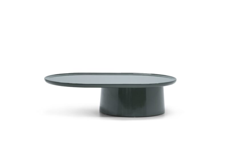 פירוט מוצר – שולחן סלון אליפסי מעוצב, עשוי מפורניר צבוע בגוון ירוק זית. ניתן לשלב כסט, קיים בכמה גדלים.