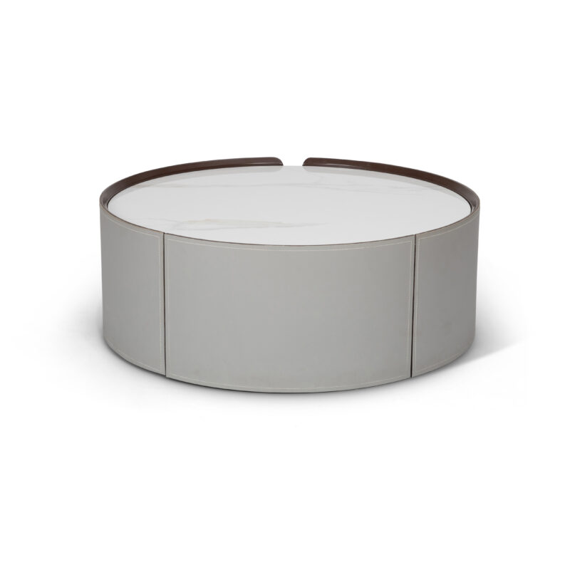פירוט מוצר – שולחן סלון עגול מעוצב, משולב פלטת פורצלן בגוון לבן וגידים אפורים, בסיס הרגל מעץ מרופד בדמוי עור גוון אפור בהיר. בשילוב שרוכים מעוצבים.
