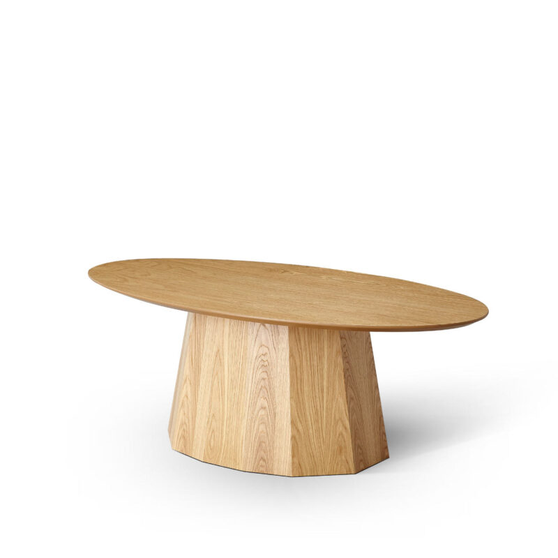 פירוט מוצר – שולחן סלון מעוגל מעוצב, עשוי מפלטה ורגל MDF בגוון אלון טבעי. ניתן לשלב כסט, קיים בשני גדלים.
