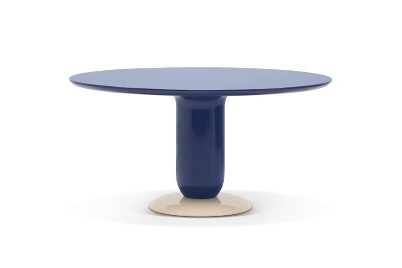 שולחן פינת אוכל עגול מעוצב, משולב פלטת פורניר צבועה בגוון כחול נייבי, רגל מרכזית באותו הגוון, פלטה תחתונה בגוון אבן בהיר.
