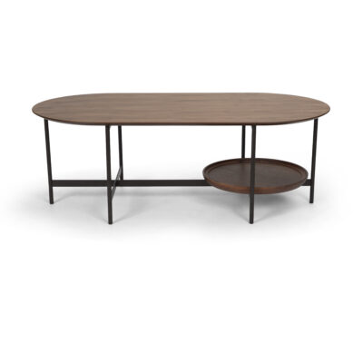 פירוט מוצר – שולחן קפה מרובע מעוצב, משולב פלטת פורניר בגוון עץ אגוז ורגלי מתכת בגוון שחור.